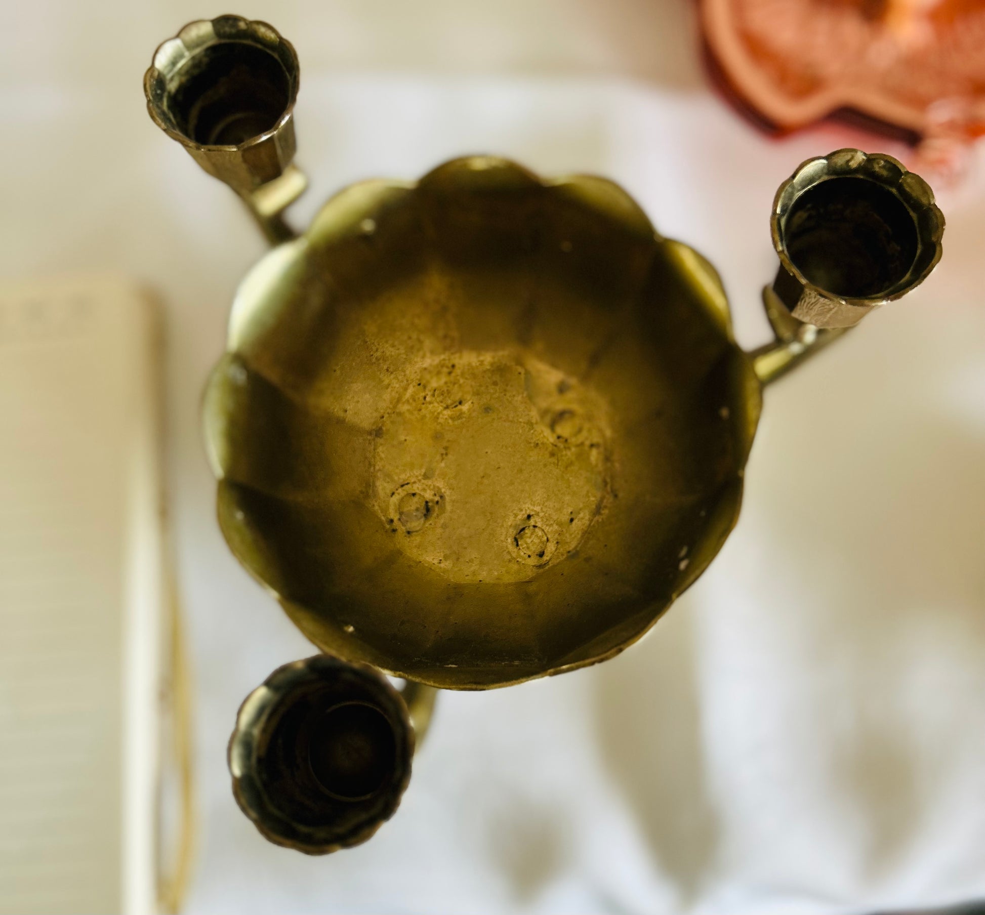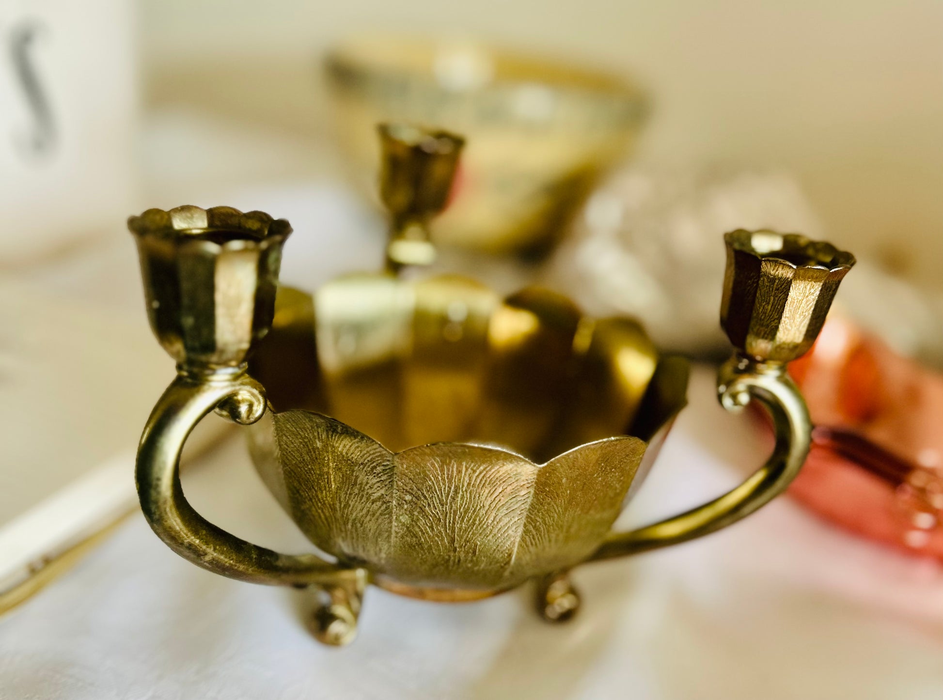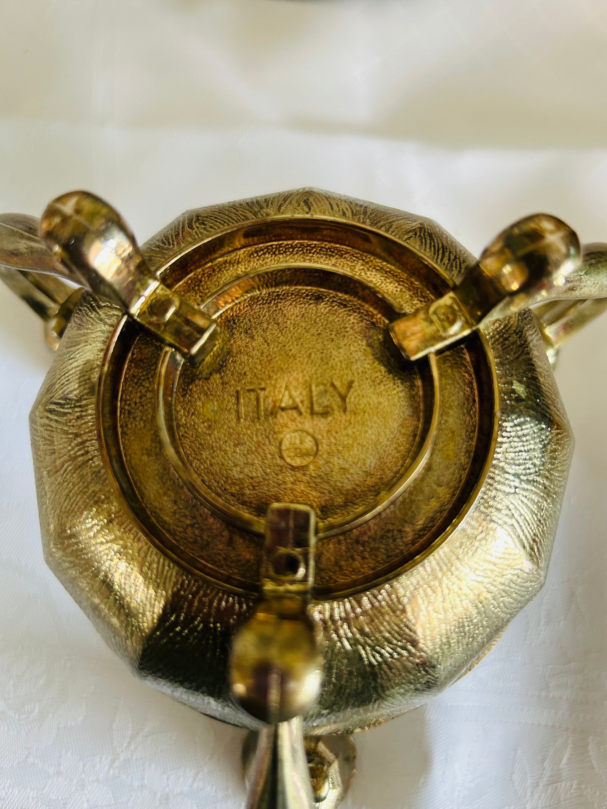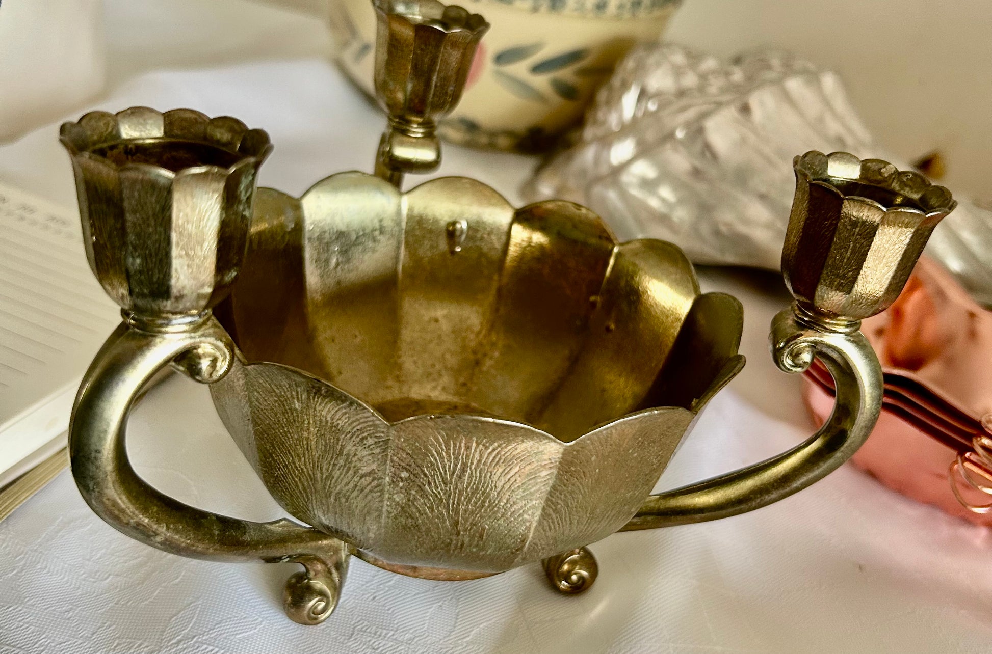 Beautiful Italian flower base adorned with three candle holders. Waiting for the special event, to shine.