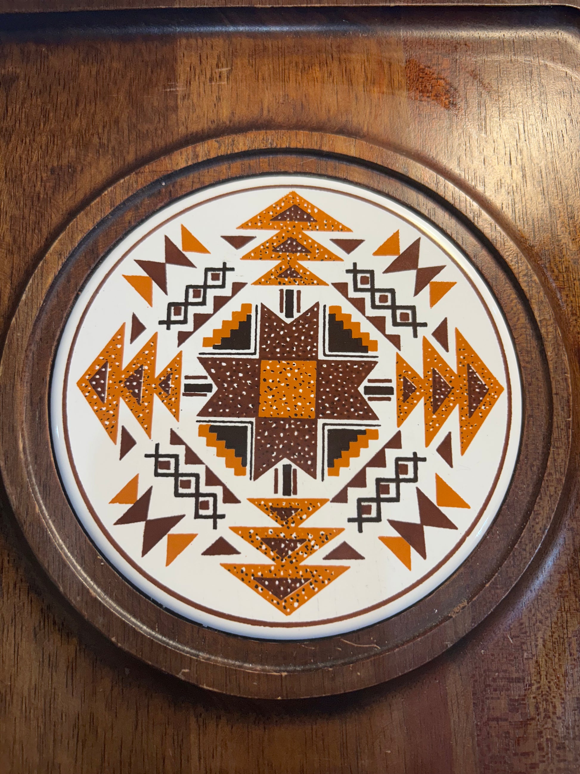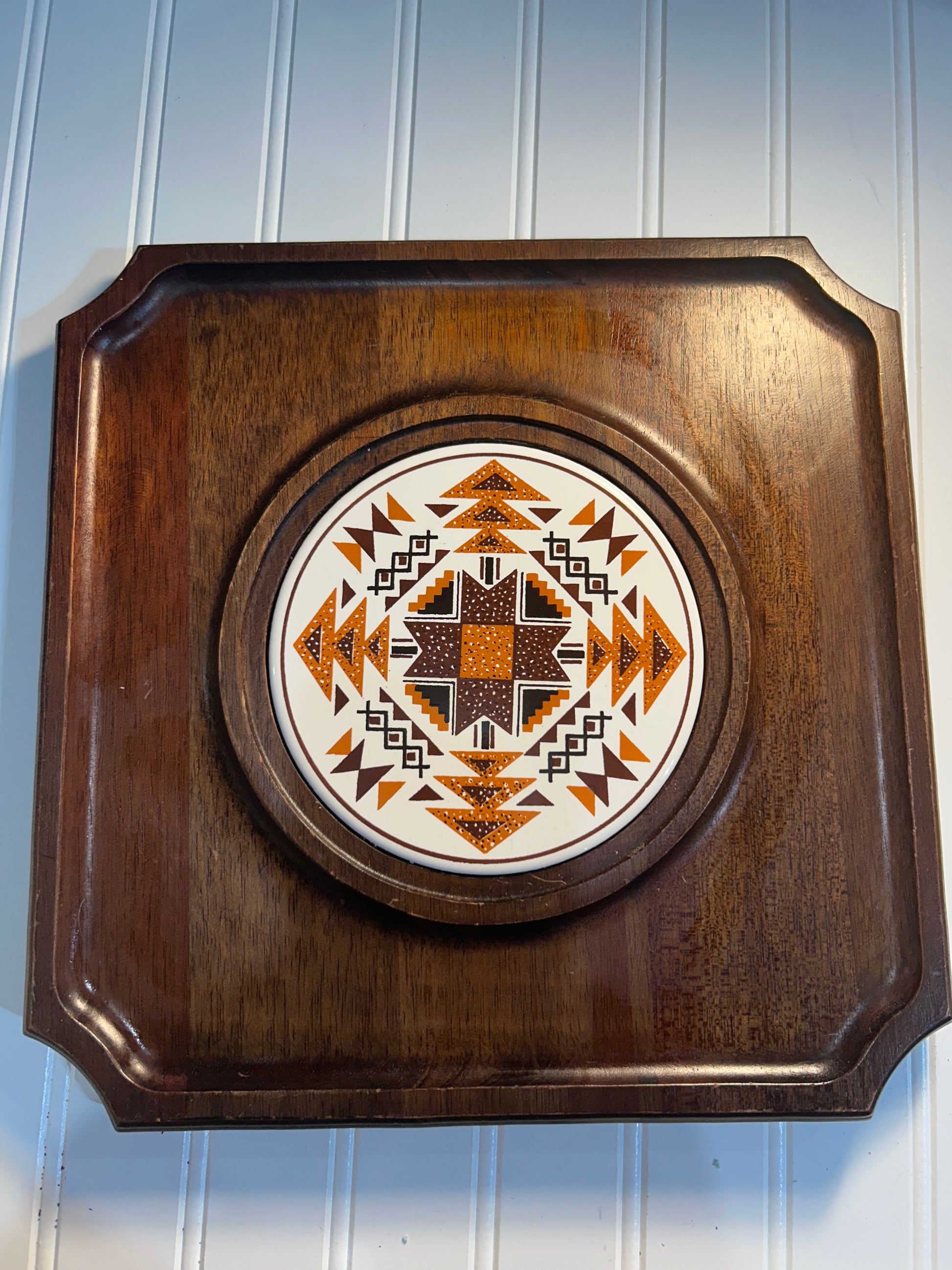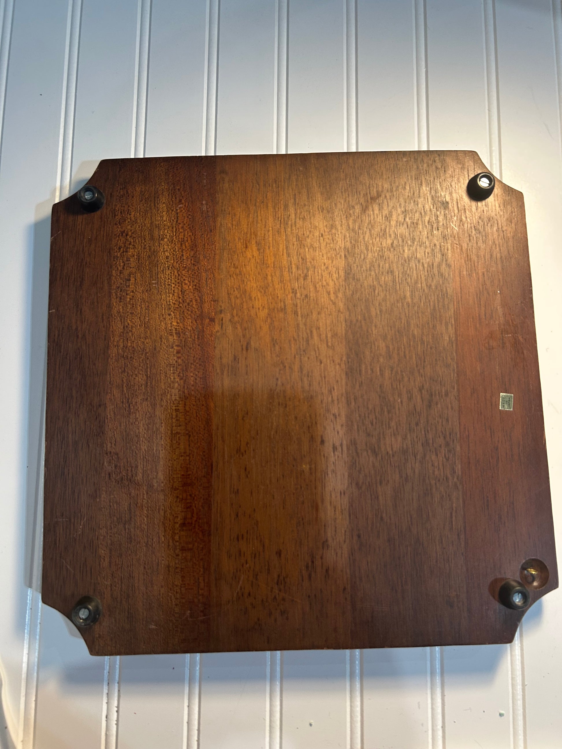 This MCM tray is made of ceramics and wood. Centre is ceramic for hot appetizers. 12" X 12".
