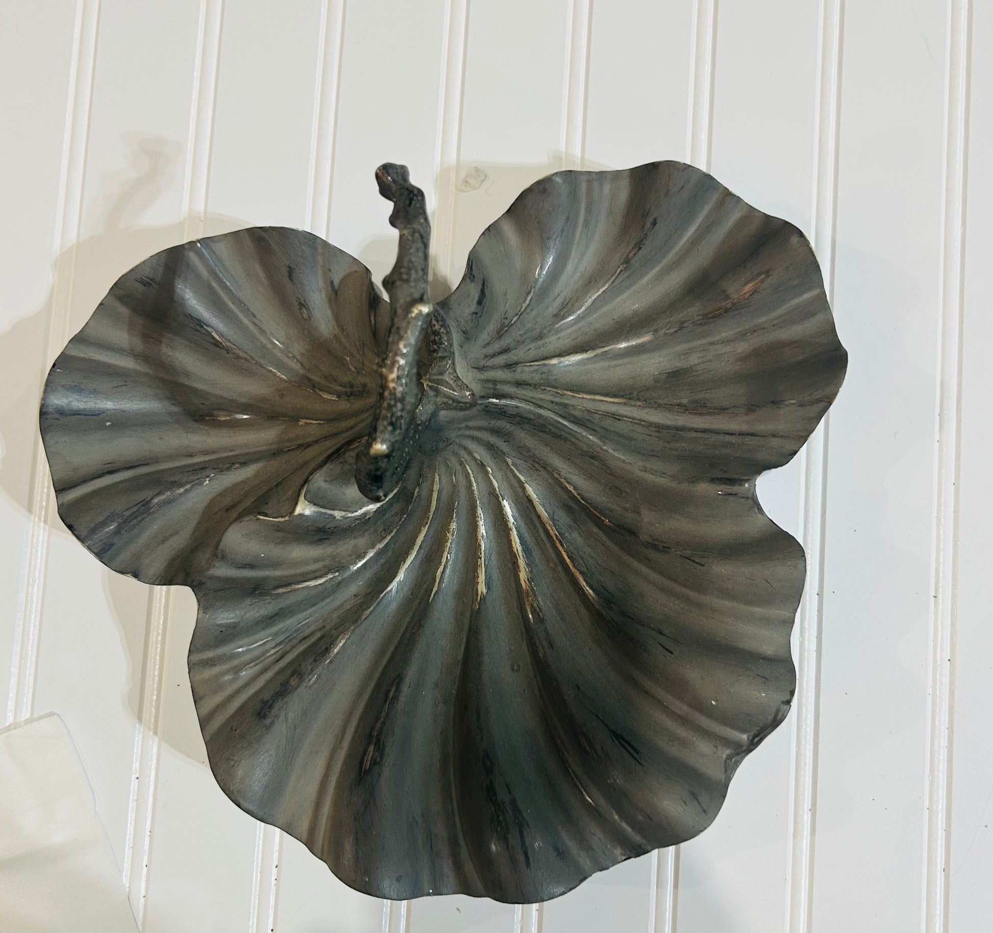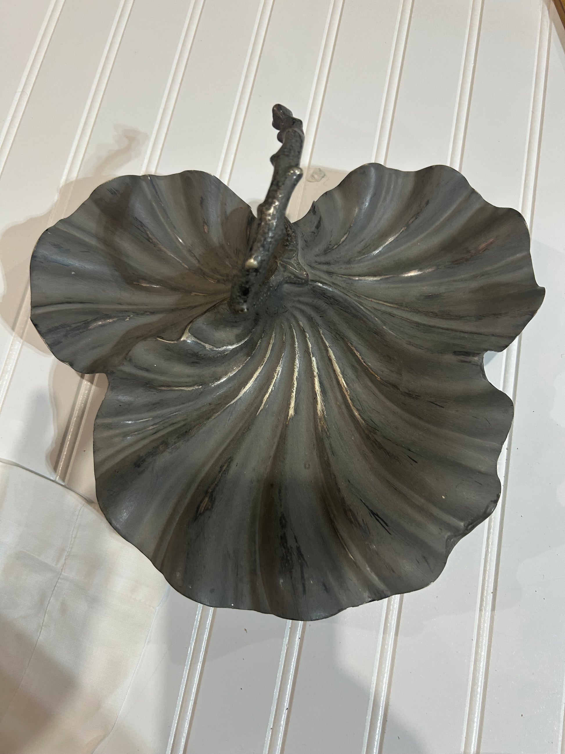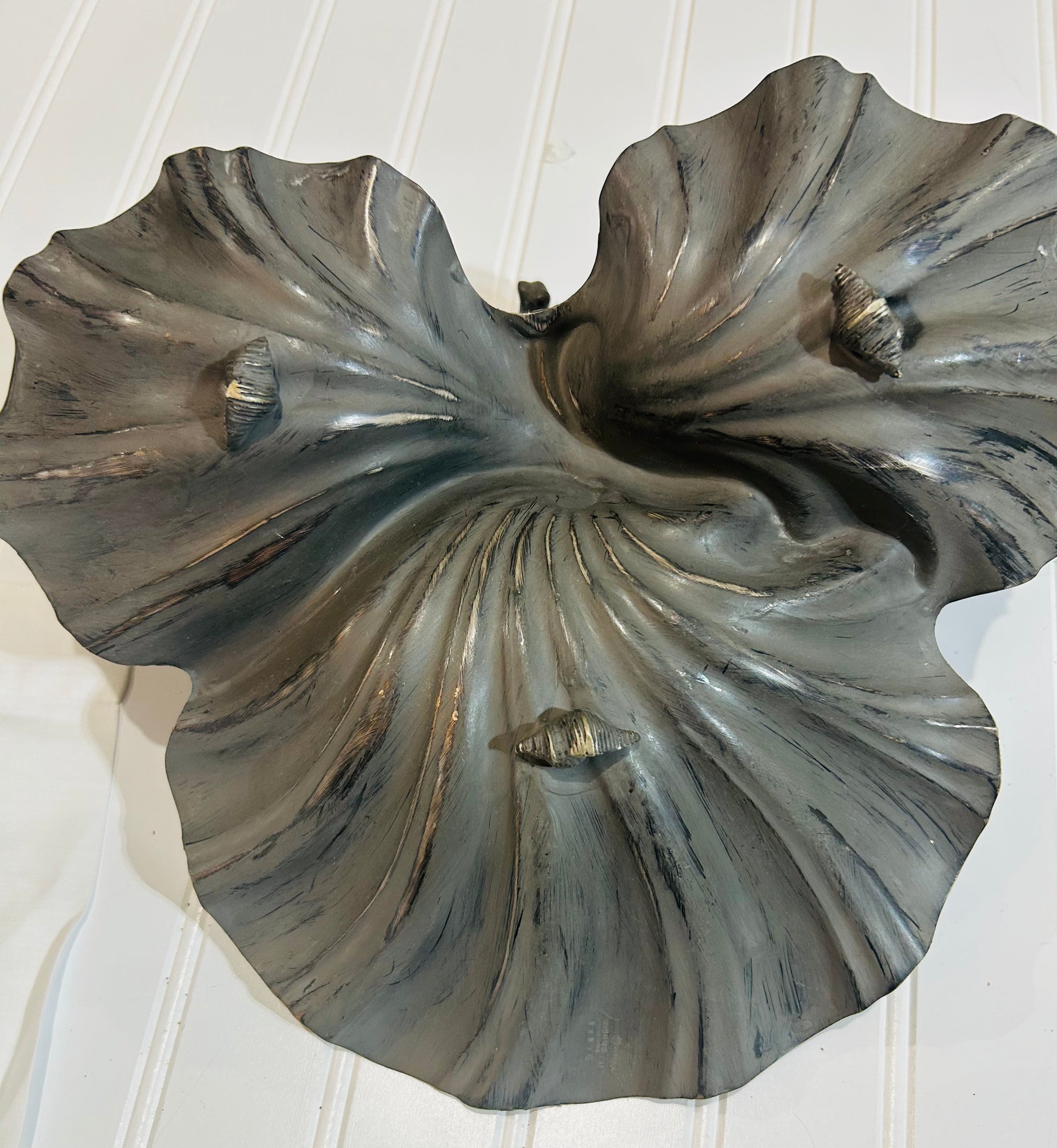 Scalloped dish, with metal shell legs. Beautiful piece for coffee table . 11 1/2 " high 2" tall.