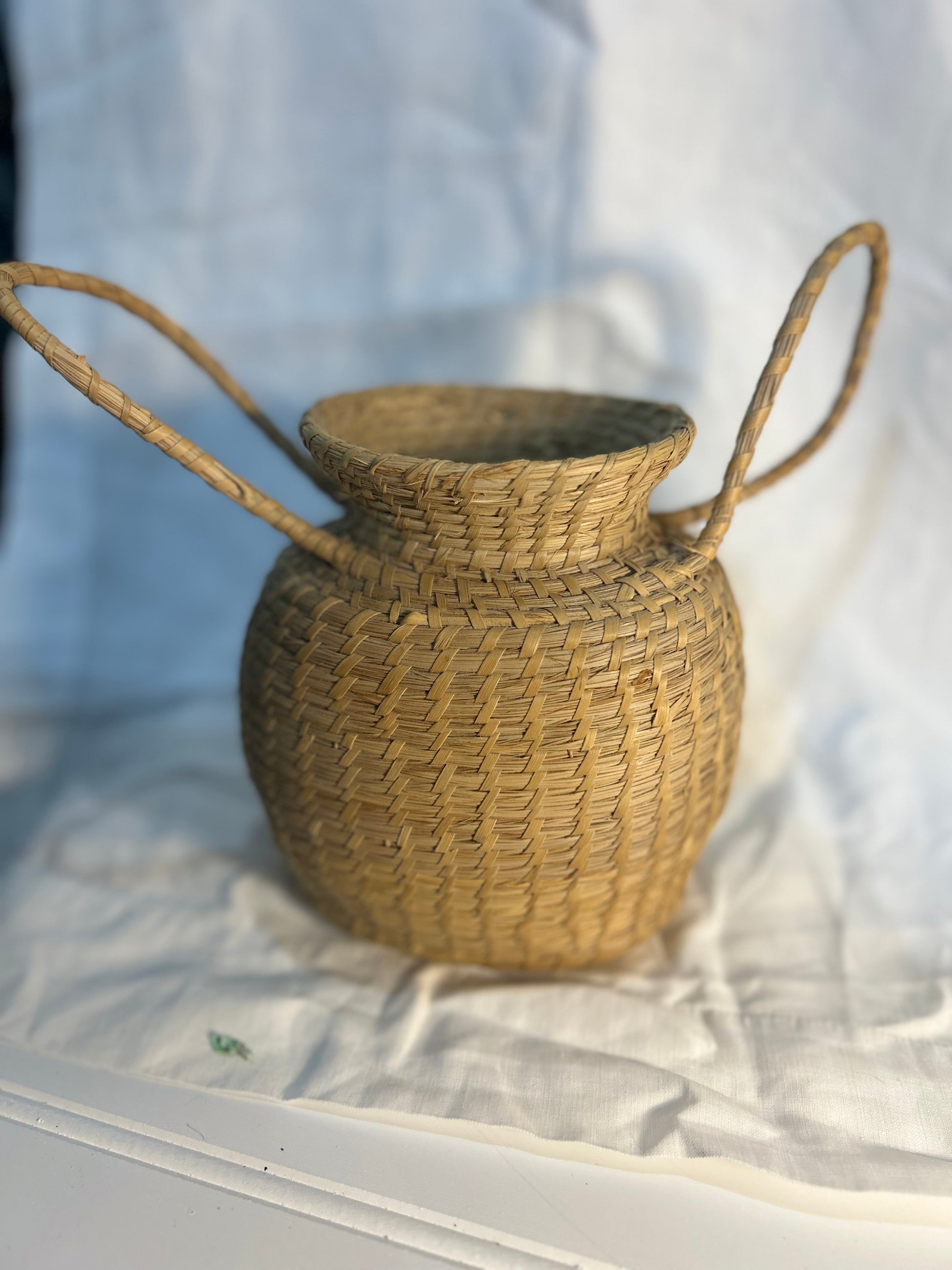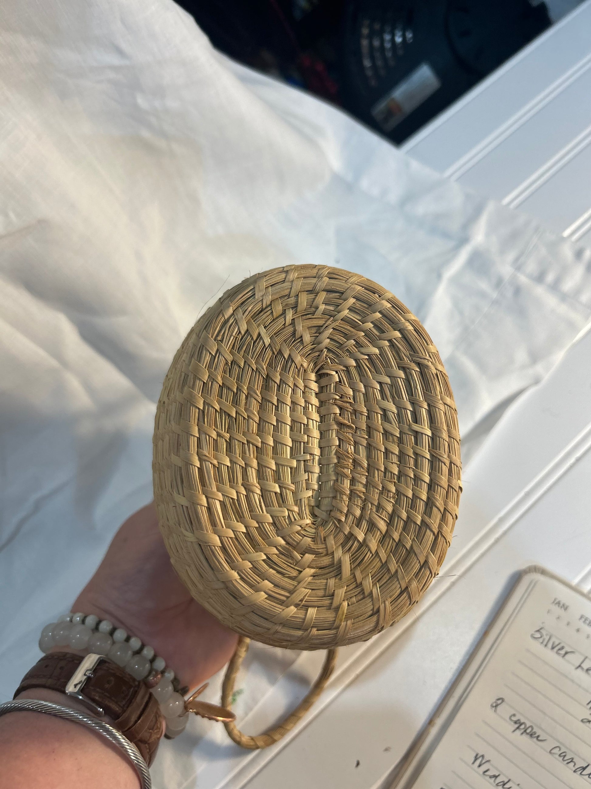 Cute woven basket, great accent piece for a side table, filled with florals. 61/2 " h and 4" X 41/2" wide. One in stock